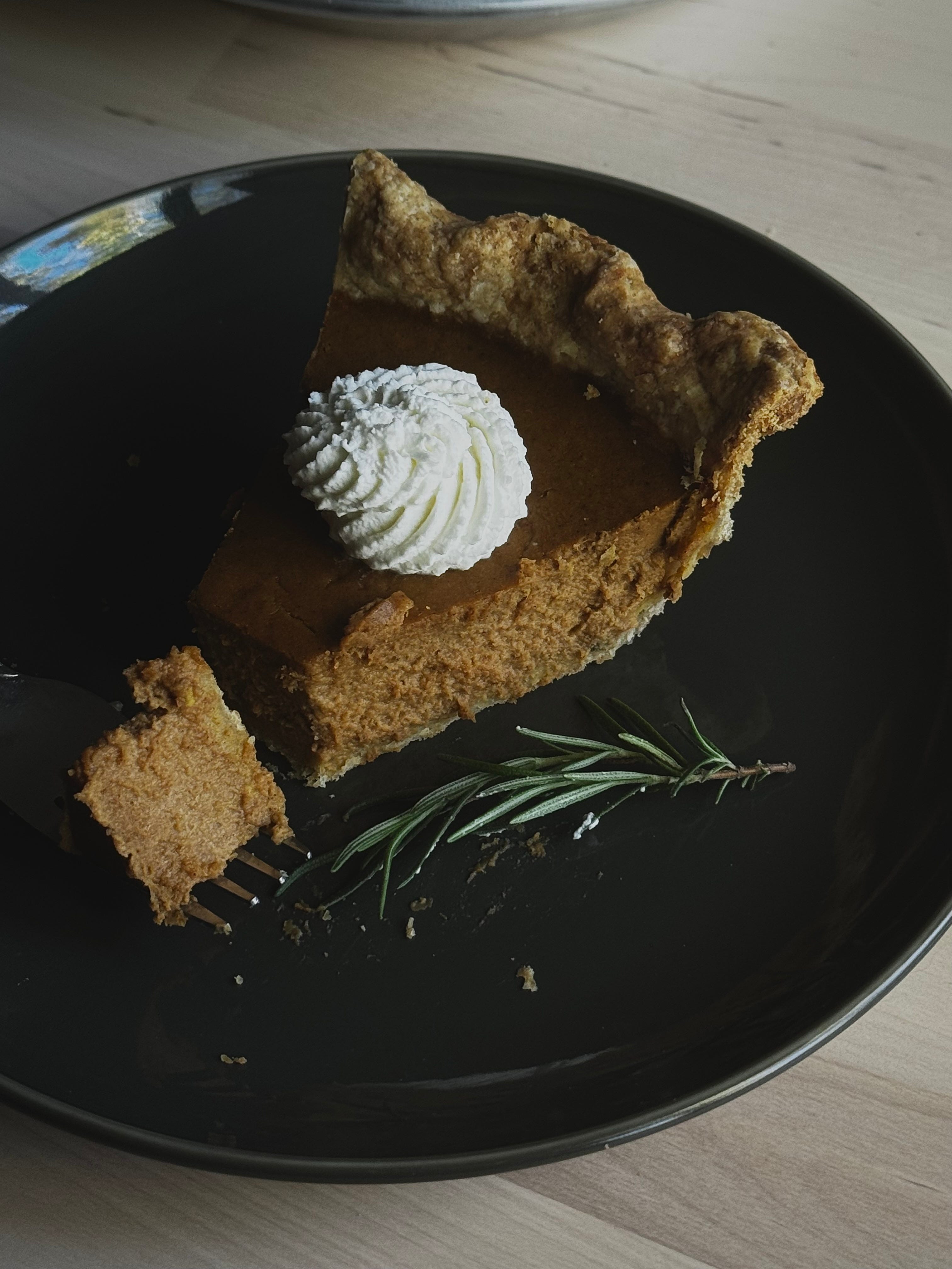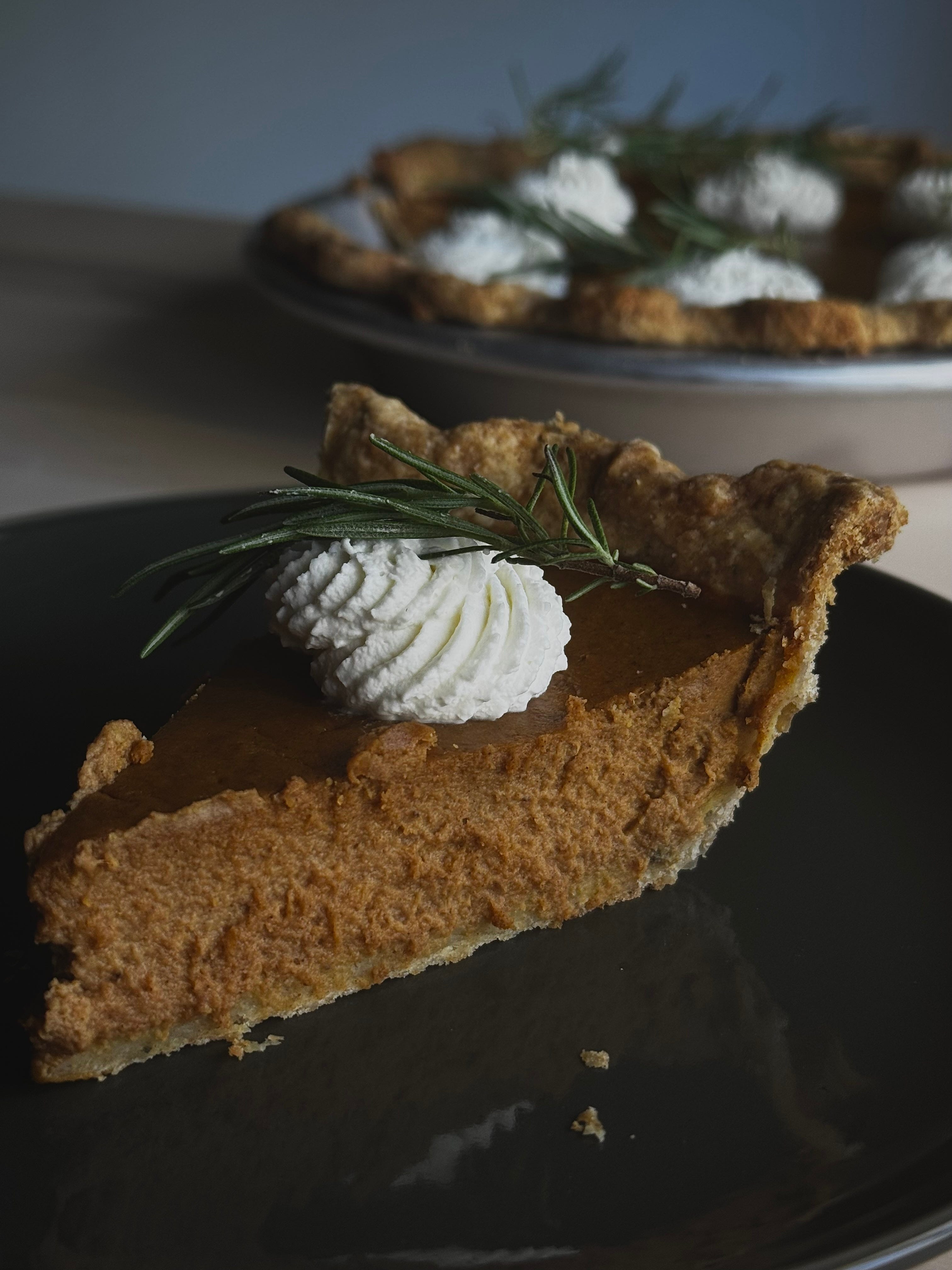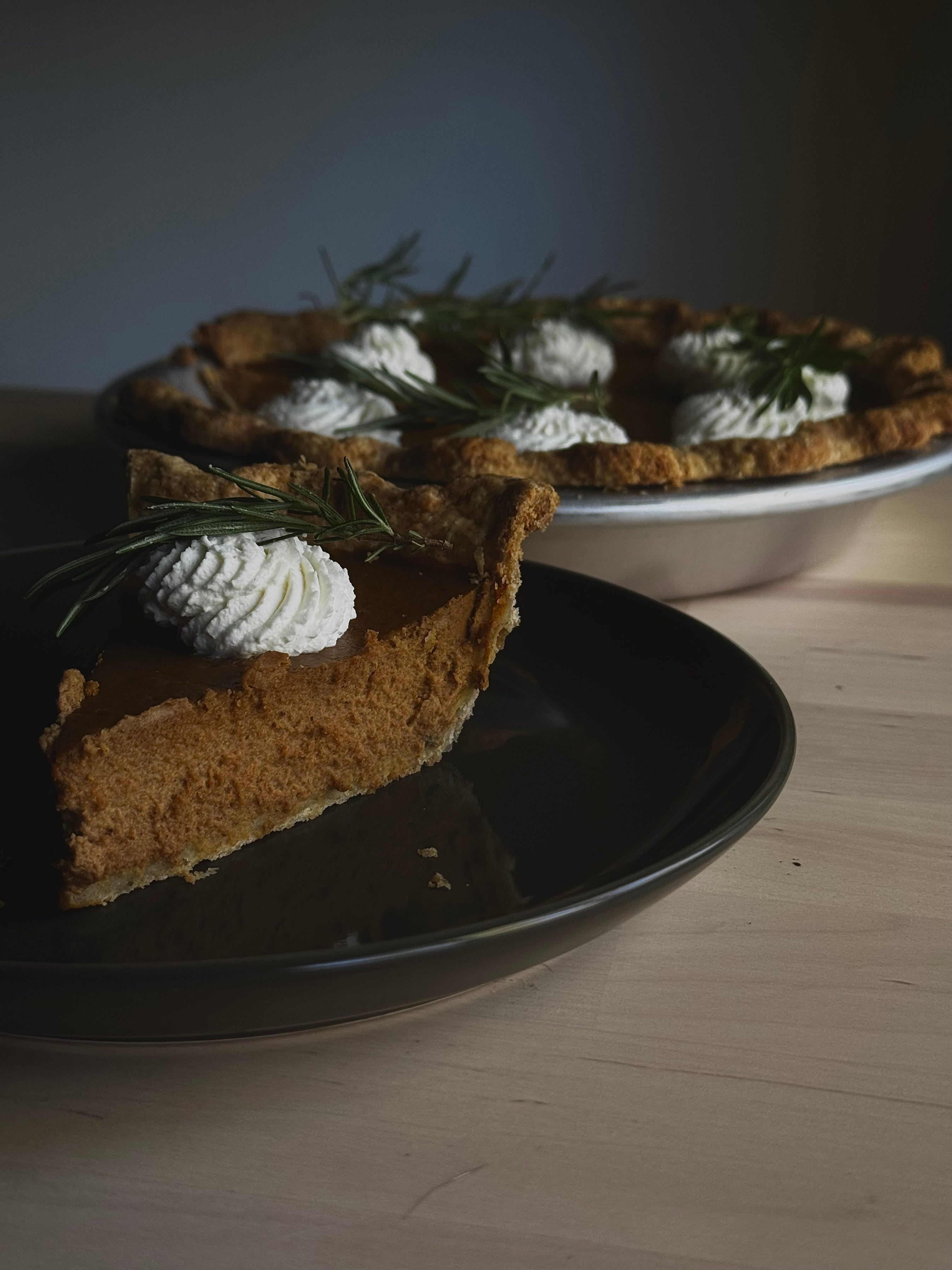 A silky, pumpkin pie made with browned butter and steeped rosemary, a slightly savory rosemary all-butter crust with a bit of rye, served with a honey mascarpone whipped cream.
