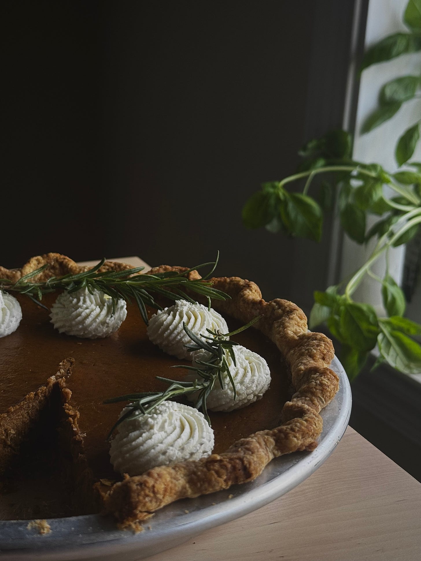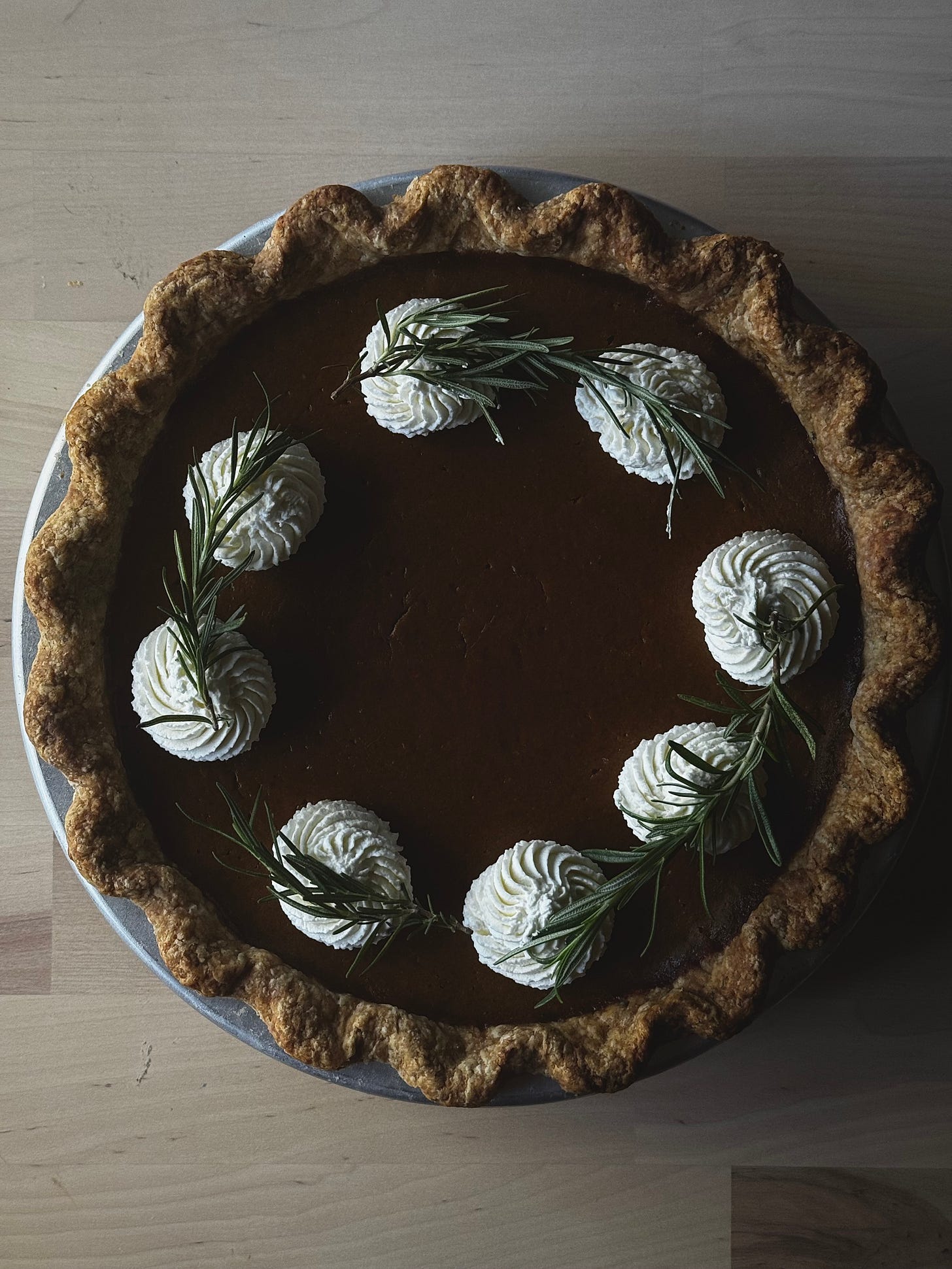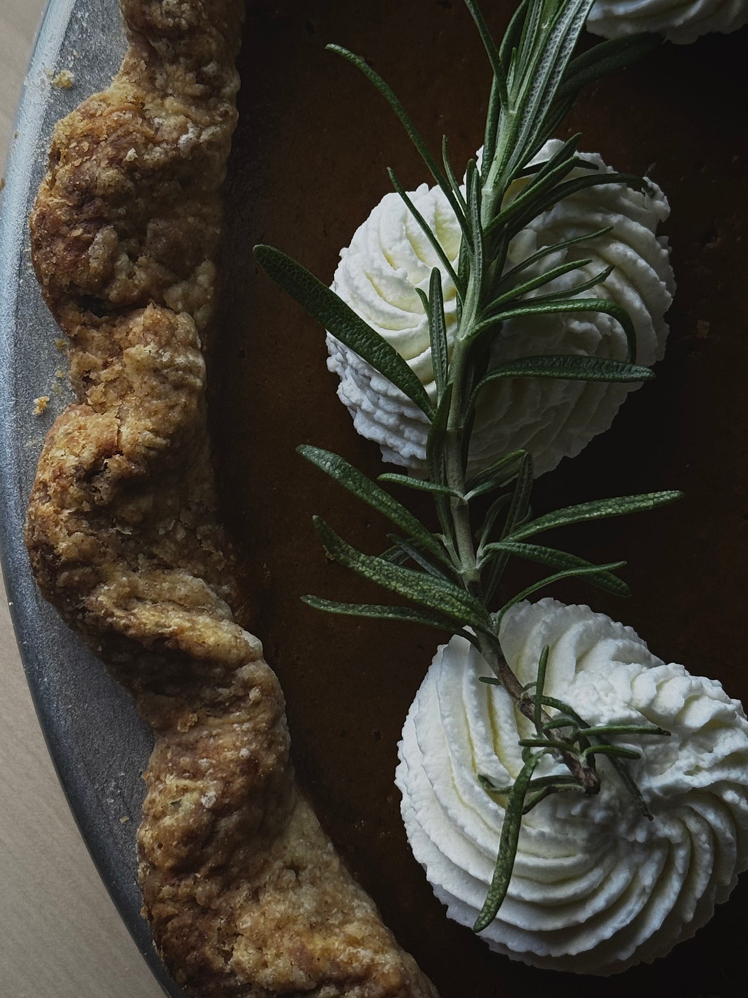 A silky, pumpkin pie made with browned butter and steeped rosemary, a slightly savory rosemary all-butter crust with a bit of rye, served with a honey mascarpone whipped cream.